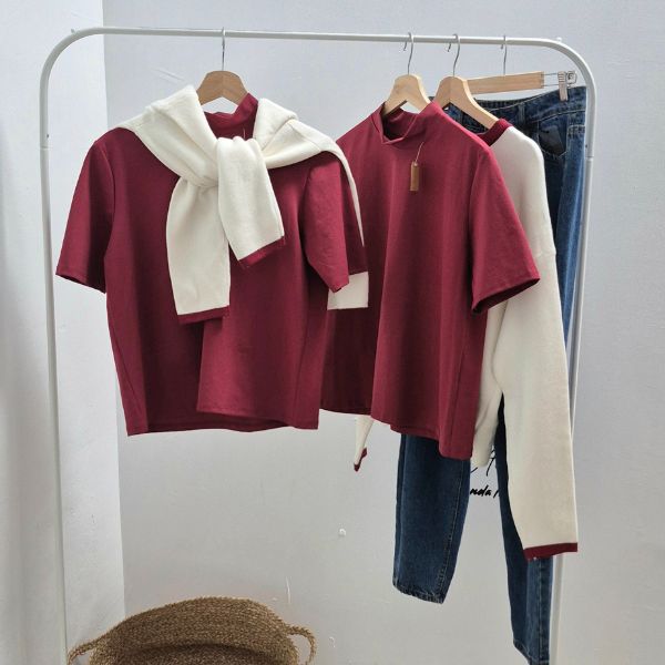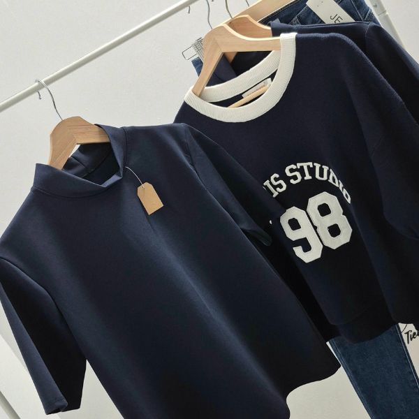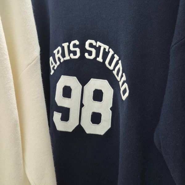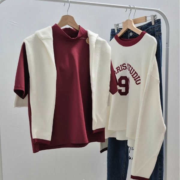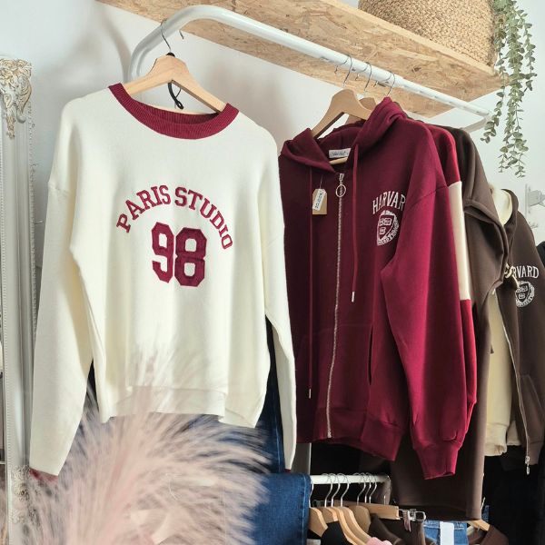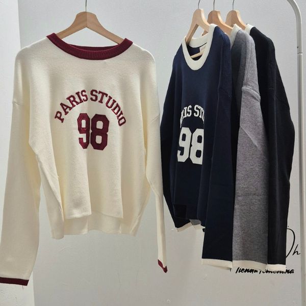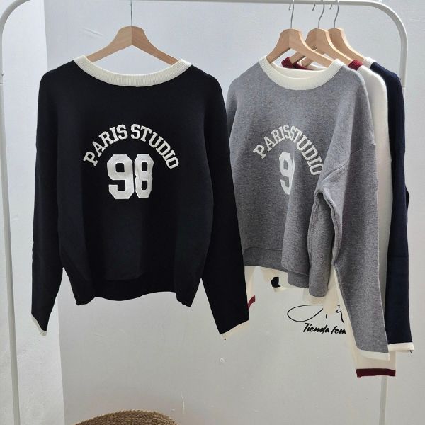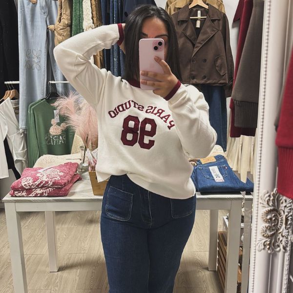 Jersey de punto de manga larga con escote cuello a la caja, letras bordadas y tejido de terciopelo.